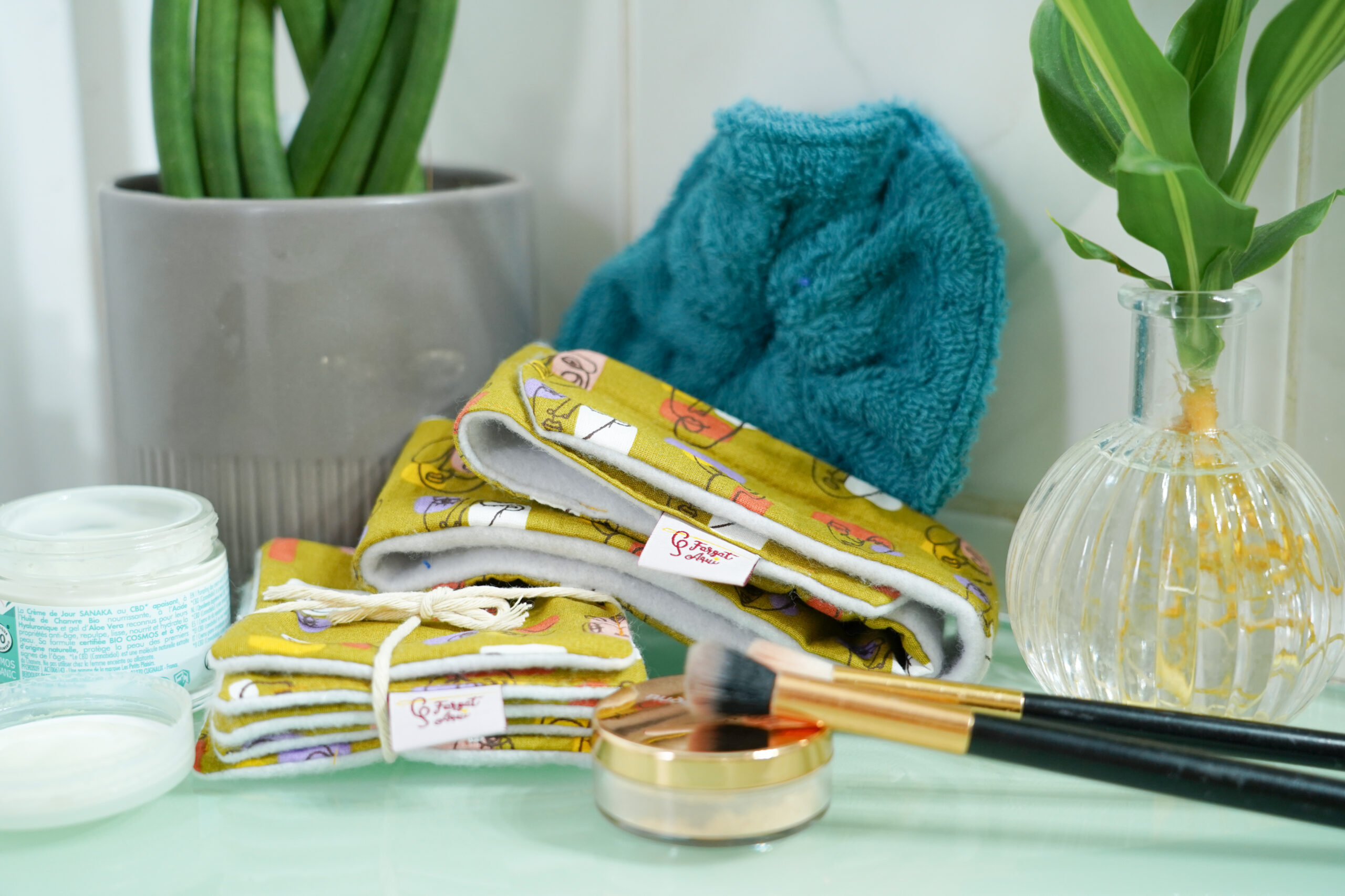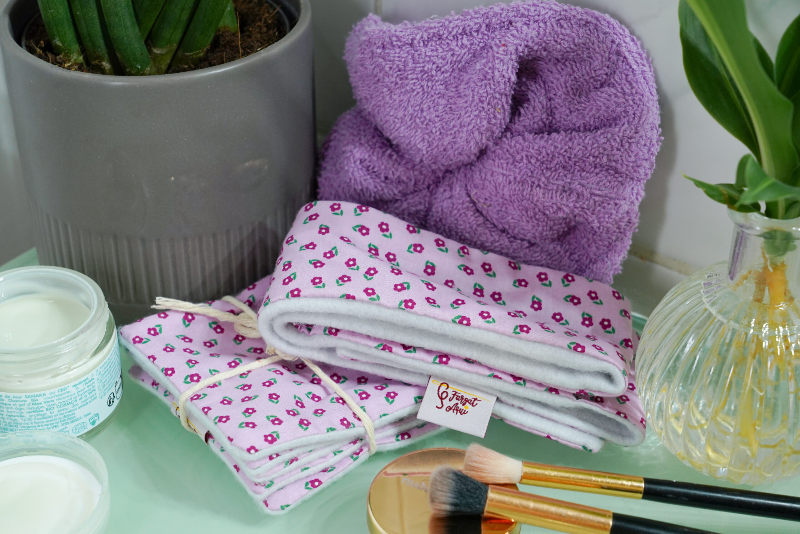 Un coffret beauté composé d’un lot de carrés démaquillants, d’un bandeau de soins et d’une fleur de douche assortis pour prendre soin de soi en couleur.